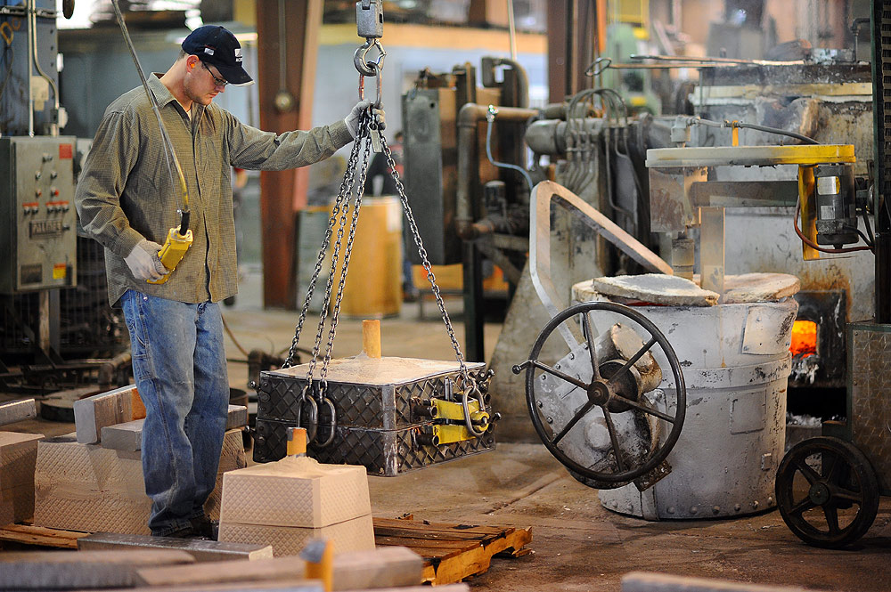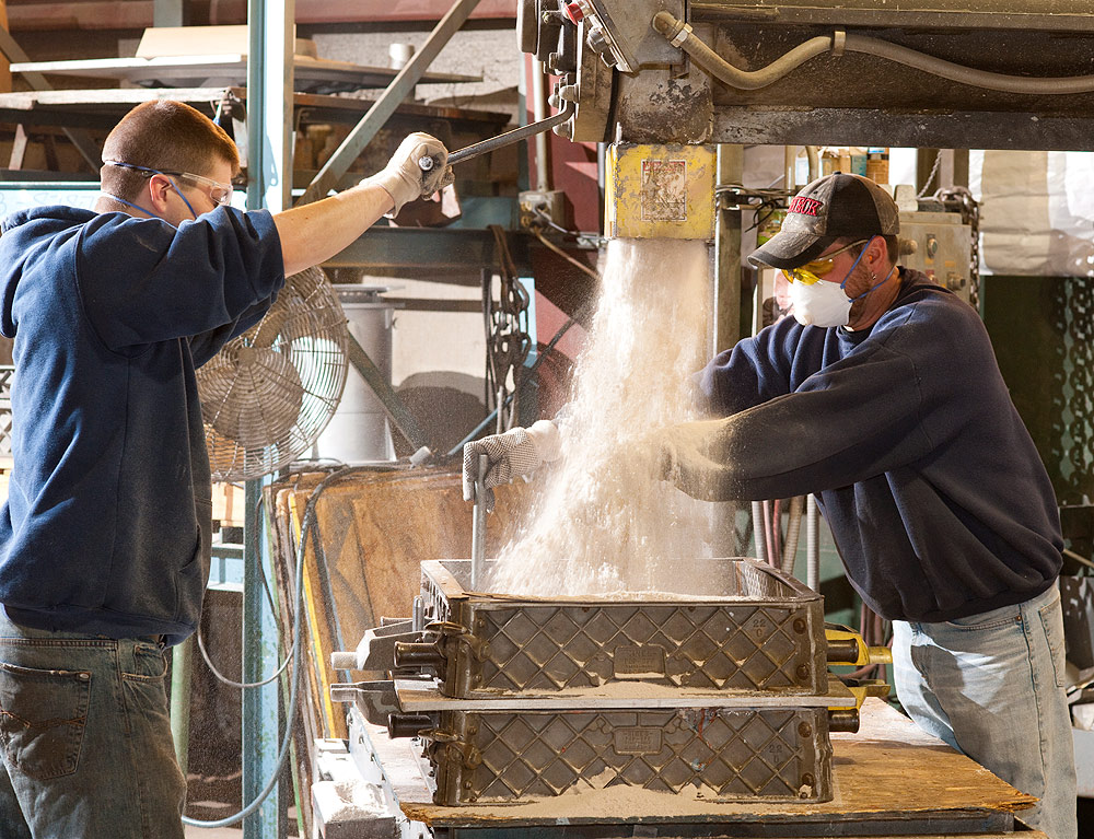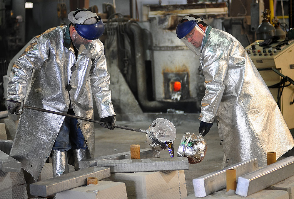 Molds are poured using hand ladles or bull ladles depending on their size. Smooth steady pouring reduces turbulence and oxide formation.